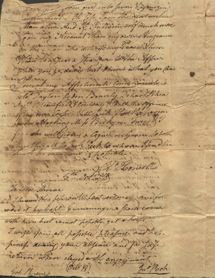 dear girl from me into severe and agonizing confinement— Oh Colo: I am the most wretched man alive— and if I know myself much more so on her account than my own— vengeance on this man who destroyed my peace and hers. Please to appear a stranger to the affair when you go down but observe what you can. Present my affections compliments to Colo: Dayton Ogden Bearly DeHart Rhea Major Bloomfield and Conway and all the officers of my own corps— tell Jack that the person is now attacking Miss Becky in favor and I fear she will praise a Coquit in ingenuous to both. Show this all to Jack Peck to whom I send the twist he mentions if possible.