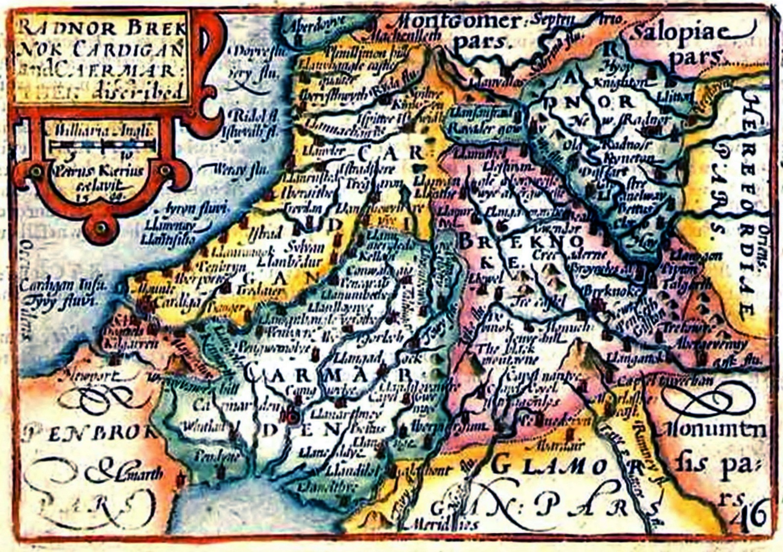 | Radnor (in Wales), 1627 — Map of Radnorshire, Wales. The Howell family traces its origins to Wales. See the Howell Family History for the Welsh genealogy. |