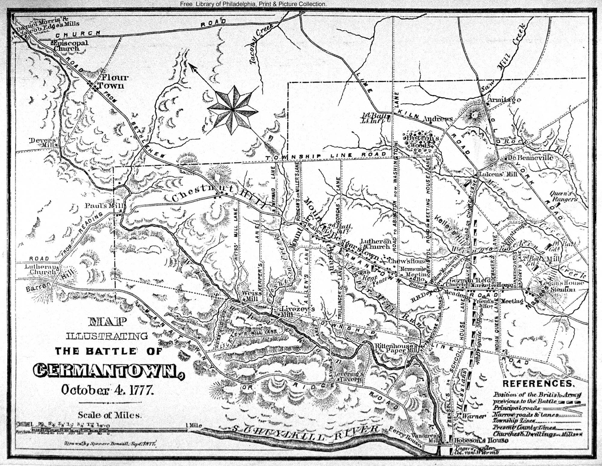 | 1777 Battle of Germantown — Montresor — Map by engineer John Montresor of the Battle of Germantown, October 4, 1777. |
