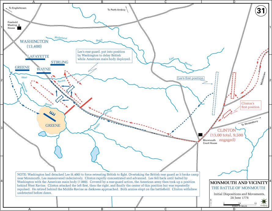 | Battle of Monmouth (USMA) — Tactical map of the Battle of Monmouth, June 28, 1778. Richard Howell fought at Monmouth; his twin brother Dr. Lewis Howell died of illness seven days after this battle. |