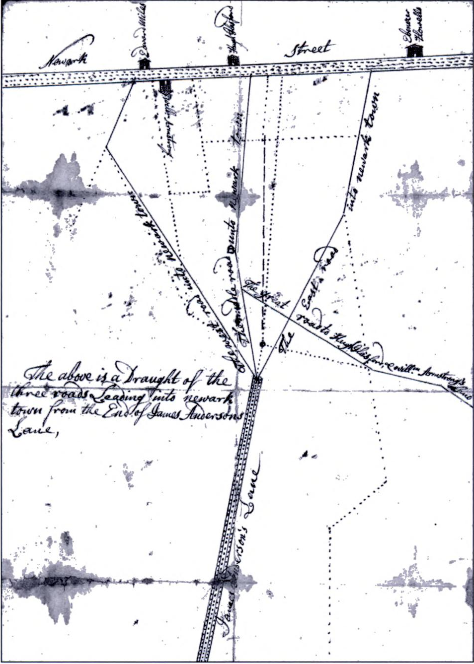 | Newark, Delaware — 1736 — Map of Newark, Delaware at the time Ebenezer Howell’s family lived there before removing to New Jersey in 1769. |